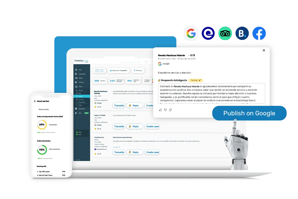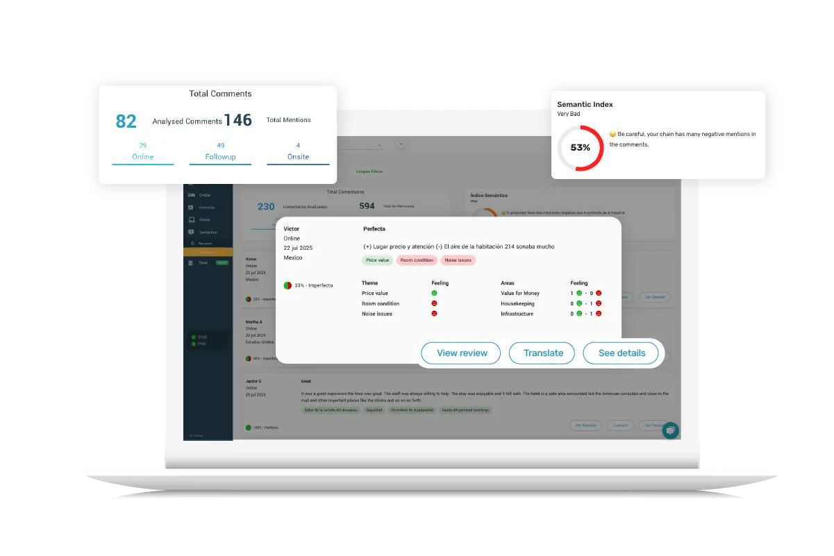 Centralize all reviews from Booking, Google, TripAdvisor, and more. Gather, analyze, and respond from a single dashboard.